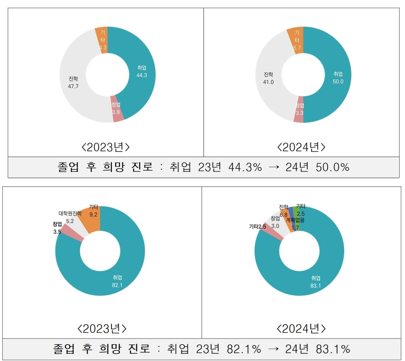 졸업 후 취업을 희망한다고 응답한 직업계고 학생 비율은 지난해 44.5%에서 올해 50%로 5.5%포인트 높아졌다. 대학생 역시 취업을 택한 비율이 지난해 82.1%에서 83.1%로 늘었다.